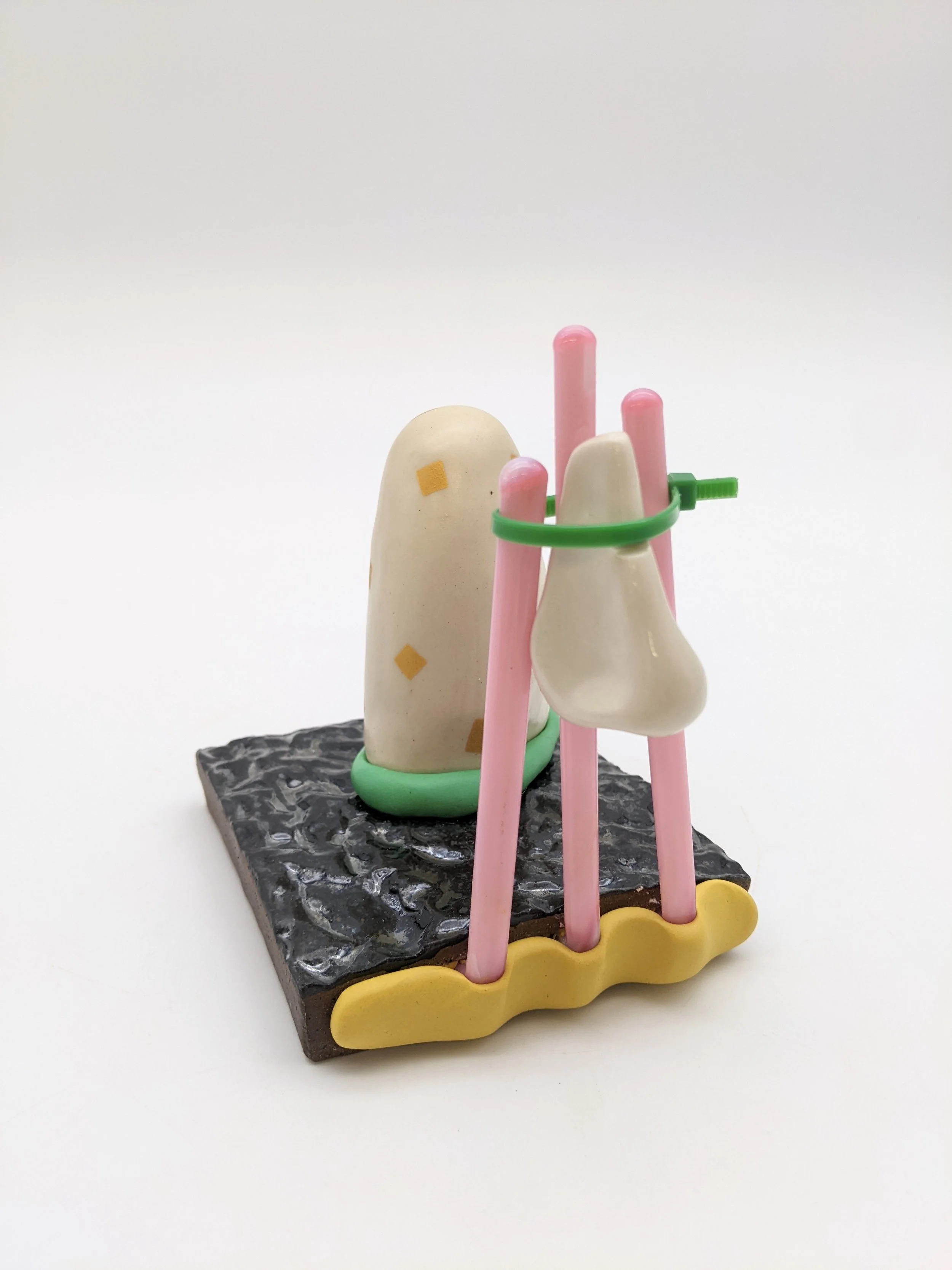 Ceramic, epoxy, glass, gold decals, and a zip tie